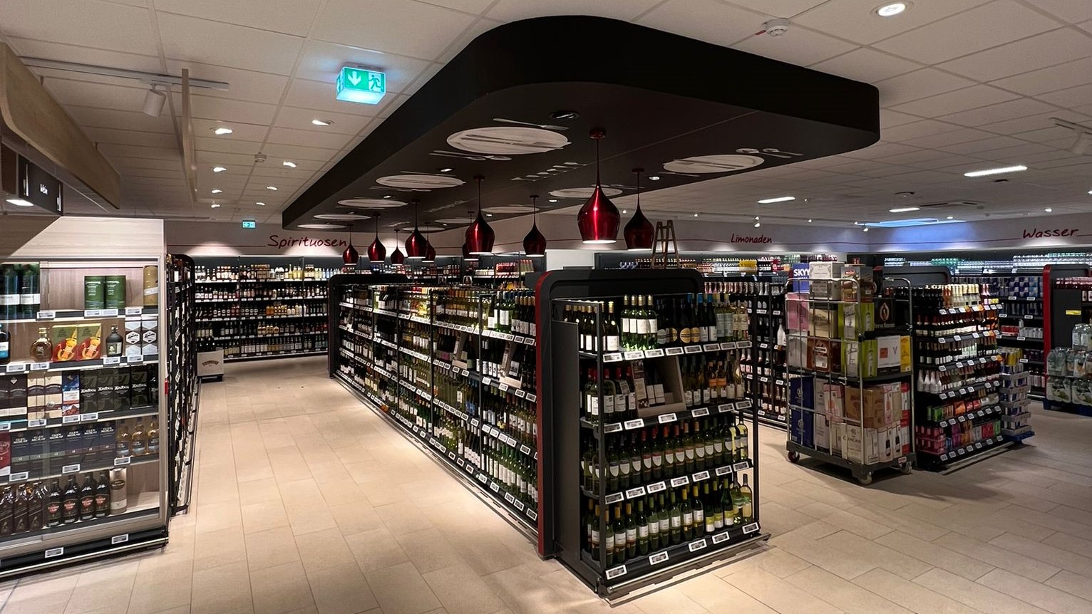 This is the current wine section of some stores belonging to German supermarket chain "REWE". These red vibrants in their wine section were supplied by Searchlight Electric and they are in size and structure that is comparable to that of Marks & Spencer in the UK.