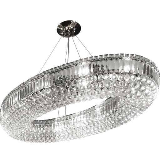 Empire is a spectacular, glittering 13 light tiered chandelier with stunning rectangular crystal prisms hanging symmetrically from a modern, chrome finish frame. Create a scintillating, jewellery-like effect with this impactful piece as the main feature in your living area or dining room. The Empire 13Lt Chandelier is a breathtaking centrepiece that effortlessly combines elegance and functionality. With its 13 lights, stunning clear crystal glass pieces which will reflect the light beautifully when lit, and chrome metal detail, it is designed to create a captivating lighting experience that will transform any space. At 128cm heigh, and with a total height of 297cm, this stunning pendant will create a focal point in any entrance or living area. Height adjustable, this chandelier can be adapted to different ceiling heights to give a different ambiance.