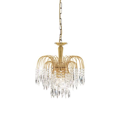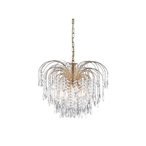 Waterfall is a stunning blend of vintage elegance and bold silhouettes. This 13 light chandelier features sleek curved gold finish arms around a decorative central frame, with overlapping tiers of shimmering crystal buttons and drops that create a picturesque cascading light effect and form a dramatic Waterfall effect when illuminated